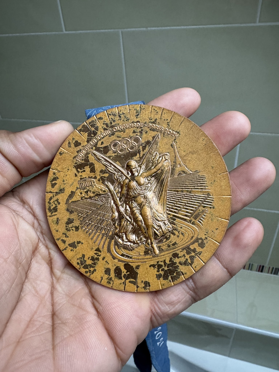 パリ五輪のメダルは、エッフェル塔の鉄片が表面にあしらわれたフランスの独自性が強いもの。組織委のエスタンゲ会長は「塔の一部をメダル獲得者に贈りたい」と語っていたが、受け取った選手からは品質を疑問視する声が上がっていた。スケートボード男子ストリートで銅メダルのナイジャ・ヒューストン(米国)らは、劣化したメダルの写真をSNSに投稿した。