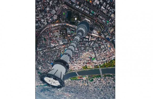 via Instagram@joelドローンを使い、東京スカイツリーのタワーすれすれを回転しながら急降下して撮影され…