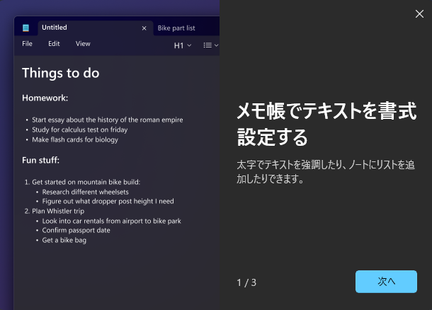 「メモ帳」はこれまでプレーンテキストにしか対応しておらず、見出しや箇条書き、太字・斜字などの文字装飾を含む書式付きテキスト(Text Formatting)をサポートしていなかった。しかし、今回のアップデートではツールバーで以下のテキスト書式を追加できるようになった。