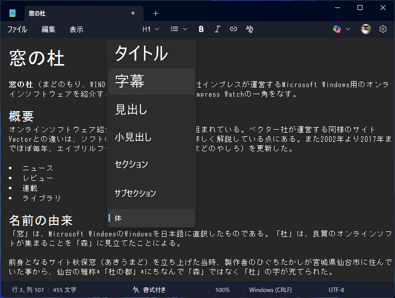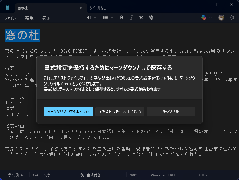 【Windows】「メモ帳」がテキスト書式とMarkdown記法へ対応 ~Canary/Devチャネルでテスト開始