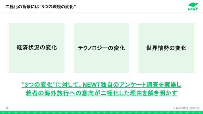 データを見ていて感じるのは、そもそも「海外旅行にあまり興味がない層」そのものが増えてきているということです。そしてその理由には、大きく3つの要素があるのではないかと思います。