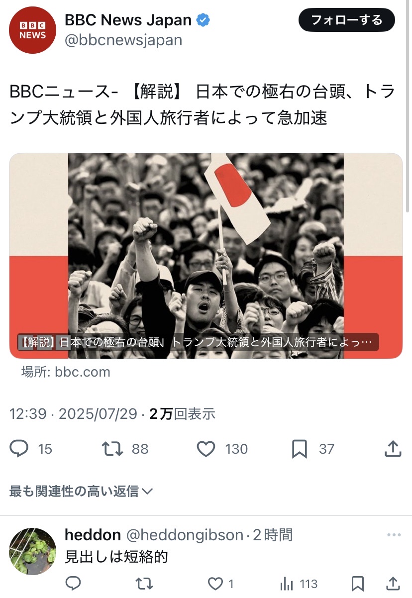 引用元: ・BBC「日本で極右支持が急加速で広がった」→普通の日本人イライラwwww [271912485]