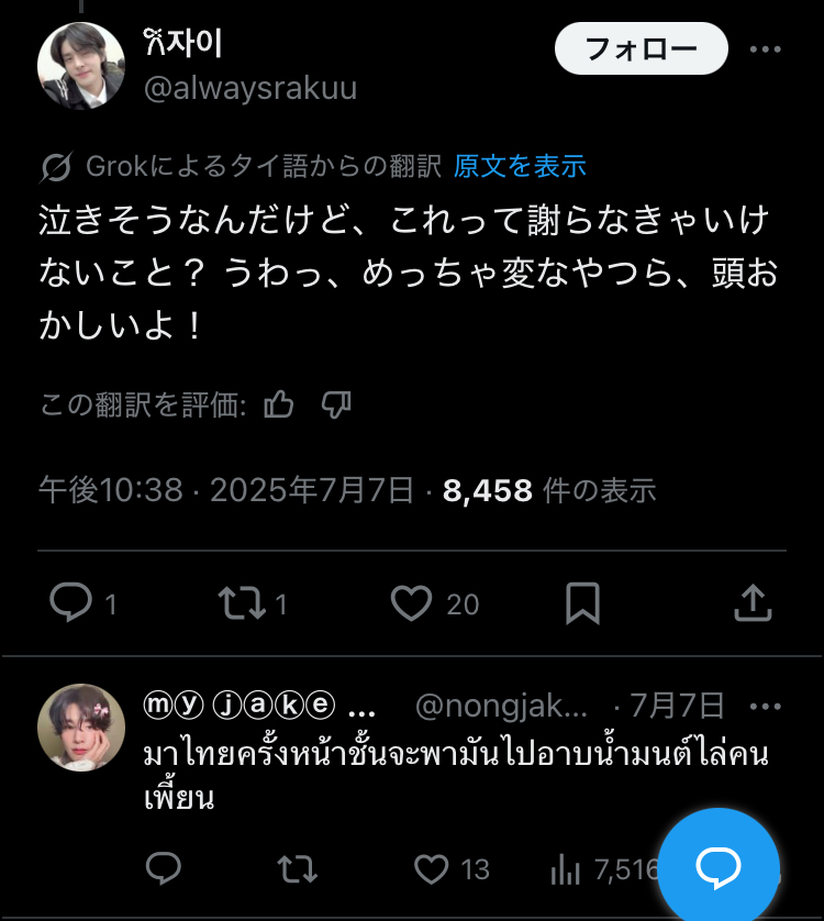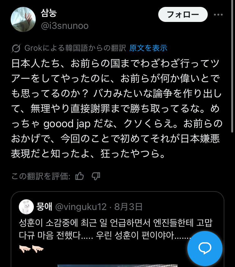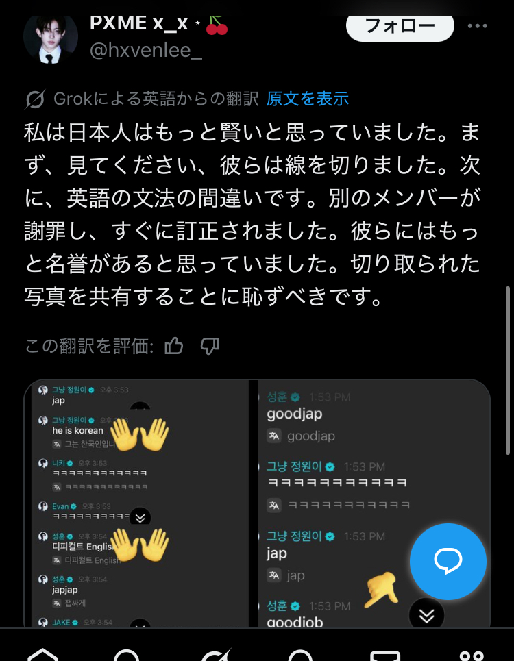 メンバーのソンフンさんが「good jap」と投稿、他メンバーほぼ全員が「jap」を連発