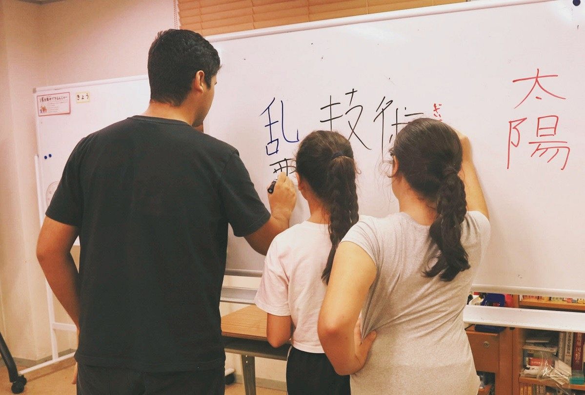 「さあ、この漢字はどう読むのでしょう」。クルド人で講師を務める大学生アランさんが問いかけると、子どもたちが元気に答えていた。