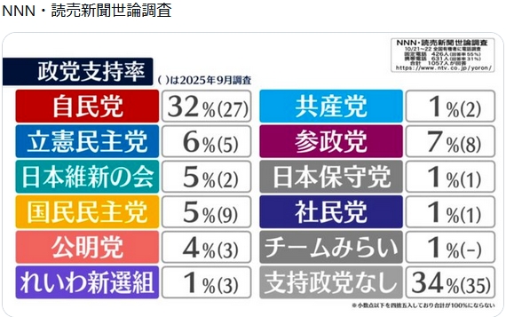 読売新聞社が21~22日に行った緊急全国世論調査では、国民民主党の政党支持率は5%で、9月から4ポイント減となった。