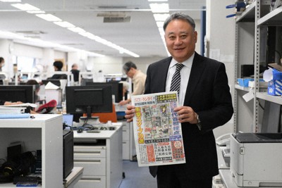 刷り上がった新聞を手にする日刊ゲンダイの寺田俊治社長