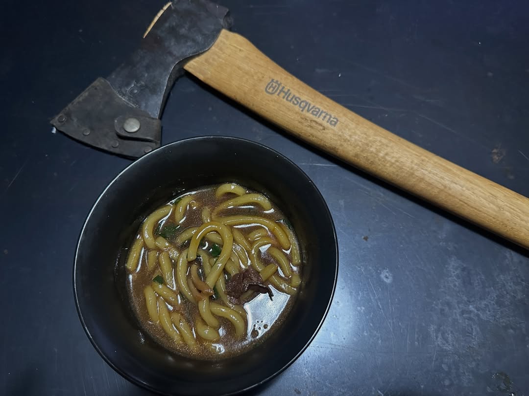 ヒロシさんは続けて、「残り汁でうどん」と綴り、画像を投稿。このたれがしみ込んだうどんにも「ハスクバーナ」のロゴの入った斧が添えられています。
