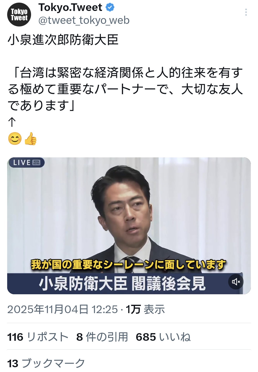 引用元: ・小泉防衛大臣「台湾は極めて重要なパートナーで大切な友人であります」 [662593167]