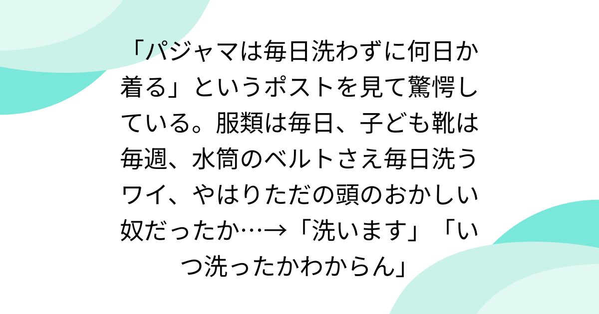 「パジャマは毎日洗わずに何日か着る」というポストを見て驚愕している。服類は毎日、子ども靴は毎週、水筒のベルトさえ毎日洗うワイ、やはりただの頭のおかしい奴だったか… みんなの反応 フォロワーとして…ごめんなさいパイセン。う、うんそれ洗わないん...