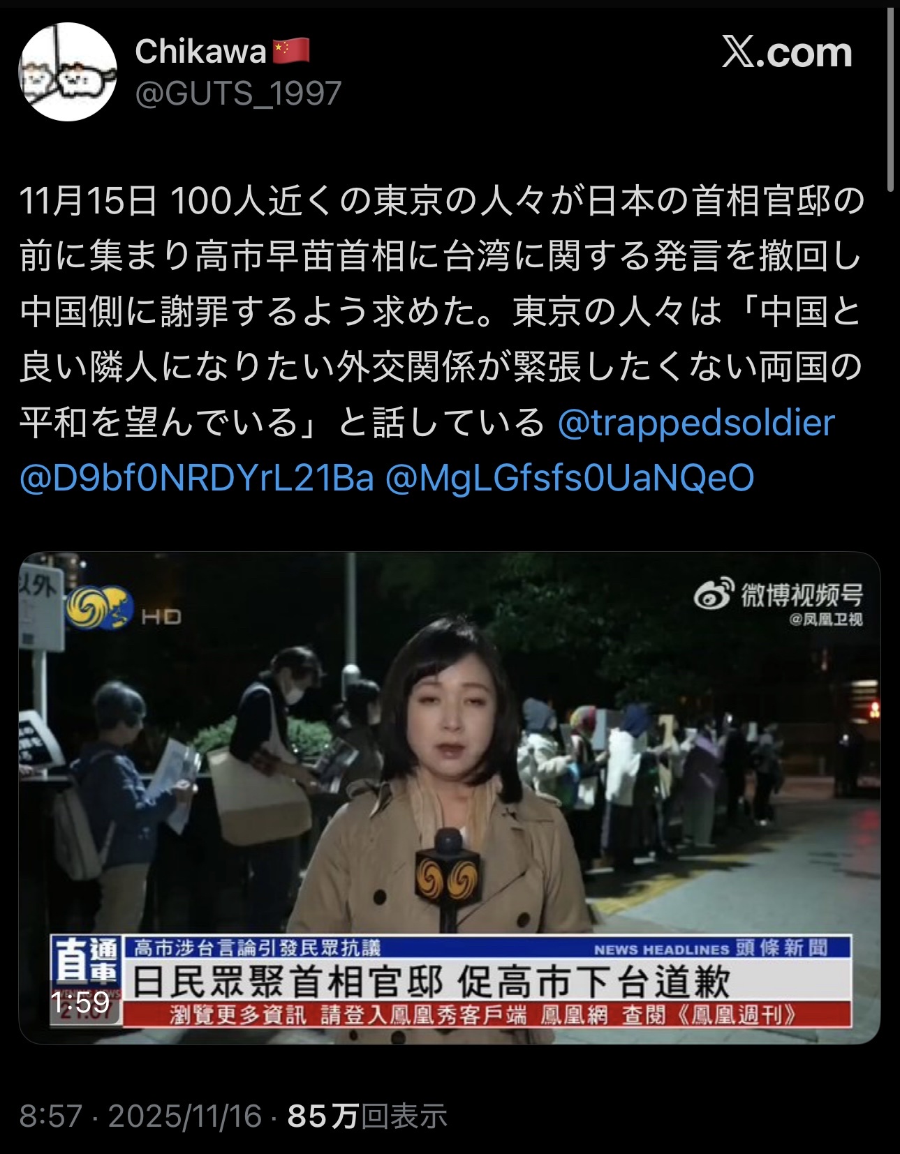 引用元: ・【動画】首相官邸前で『高市やめろデモ』→香港メディアが大々的に報道するも日本メディア報道せず [271912485]