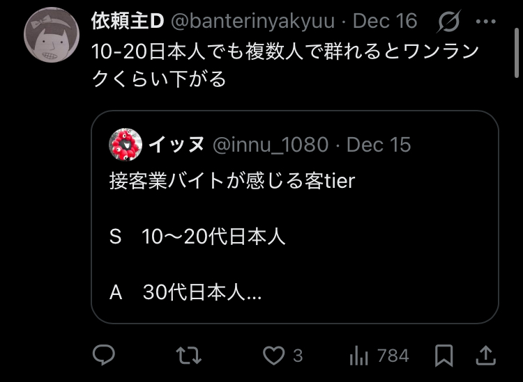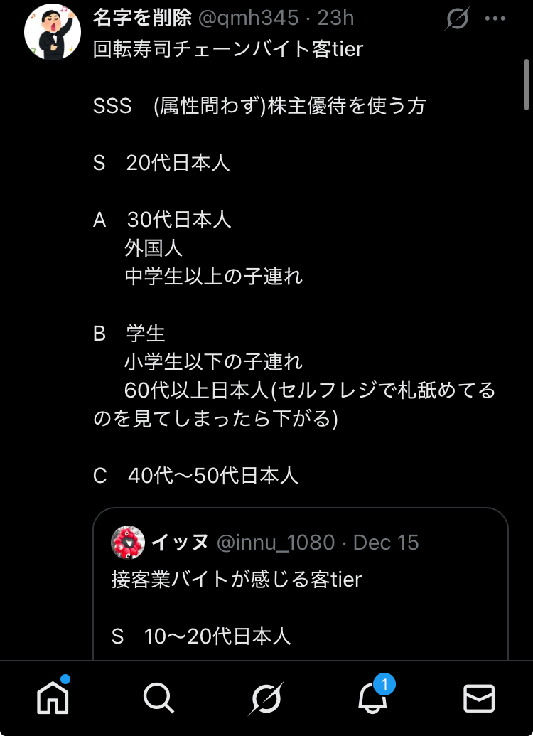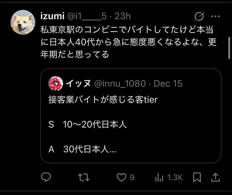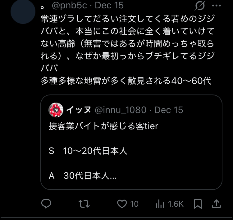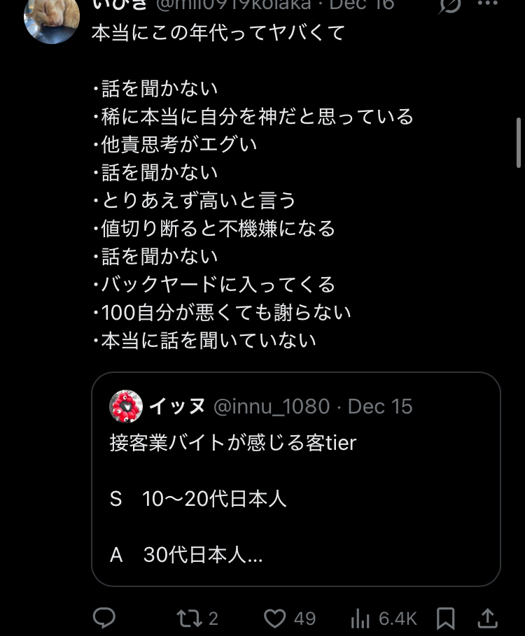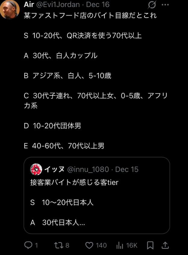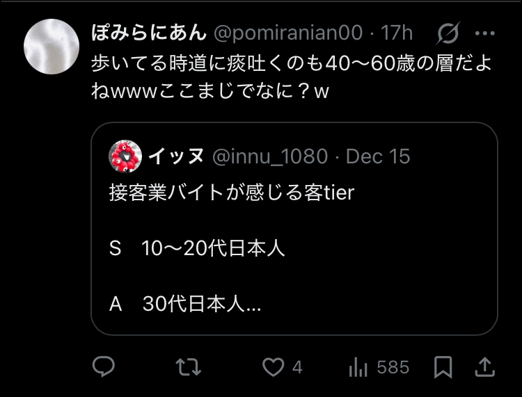 引用元: ・Z世代接客業「40-60代男、クレーマー多すぎ。外国人とか全然マシ、日本人のジジイが1番クズ」同意の嵐 [732289945]