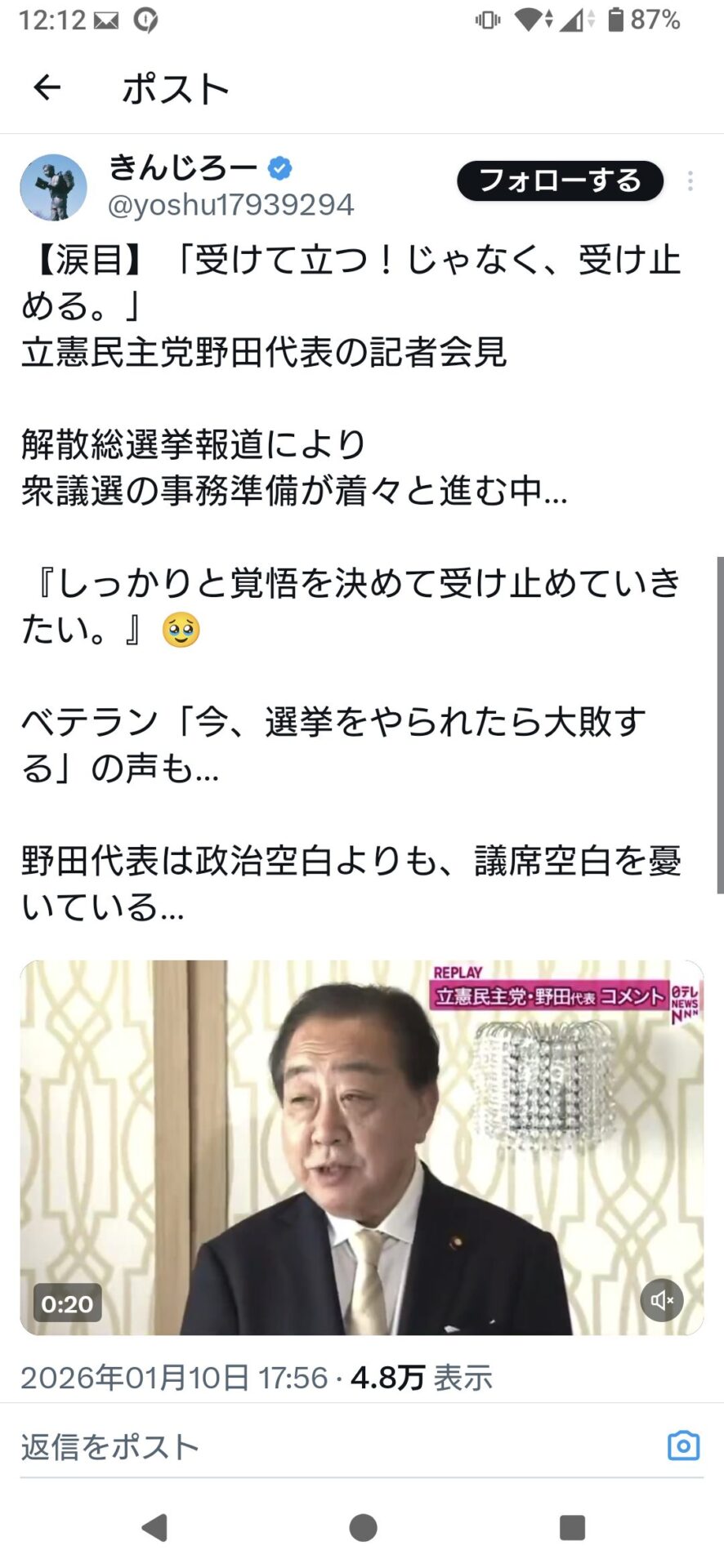 引用元: ・立憲・野田氏、衆議院解散の報道について「また政治空白を作る事に」 [662593167]