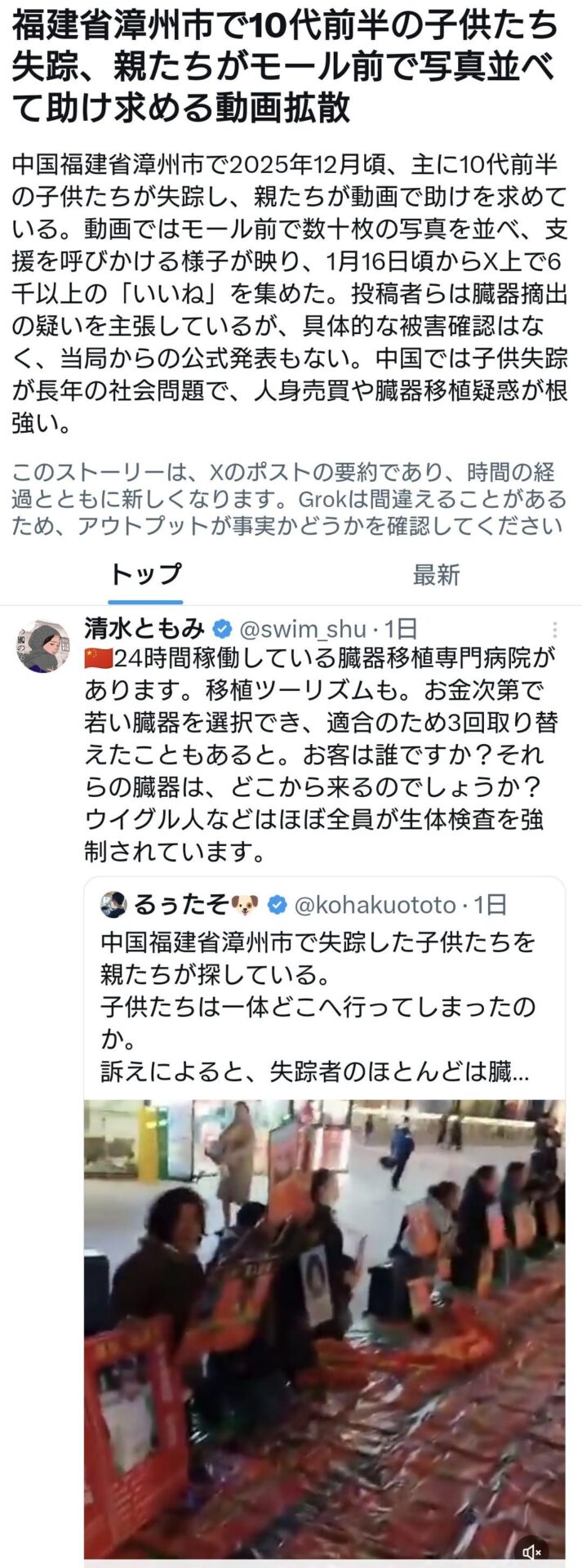 引用元: ・【臓器狩り】中国福建省で10代前半の子供たち失踪、親たちがモール前で写真並べて助け求める [662593167]