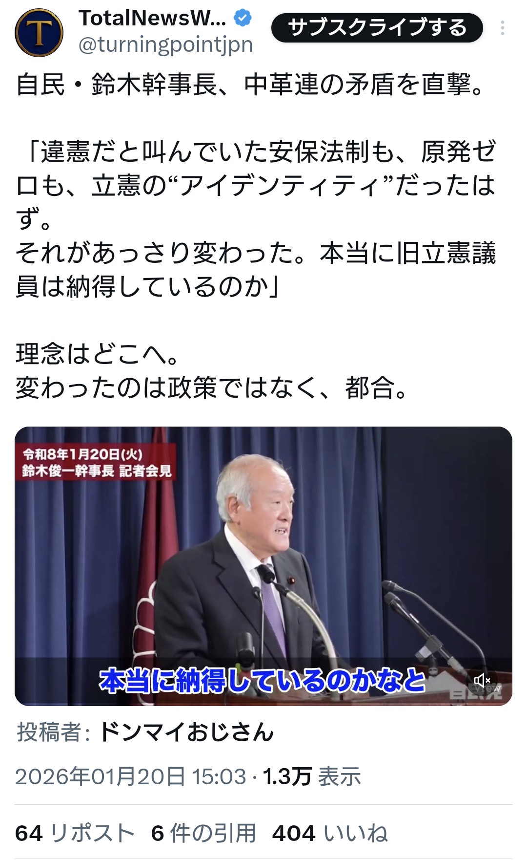 引用元: ・自民・鈴木幹事長「安保法制も原発ゼロも、あっさり変わったけど旧立憲議員は本当に納得しているのか」 [662593167]