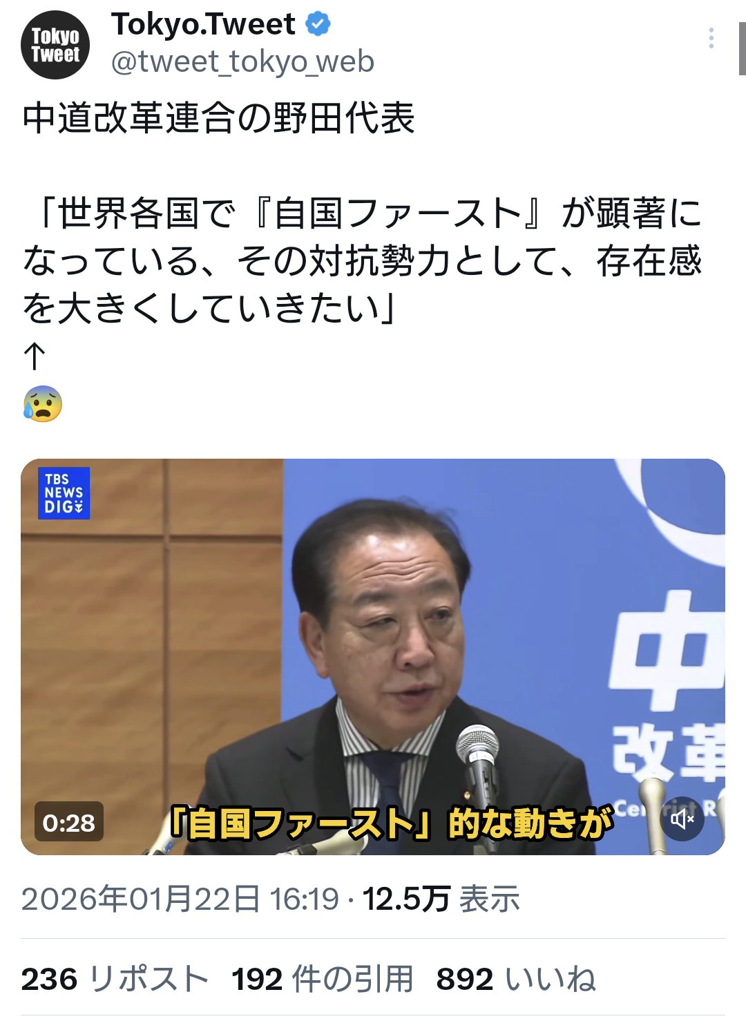 引用元: ・中革連・野田氏「世界各国で『自国ファースト』が顕著になっており、その対抗勢力となっていきたい」 [662593167]