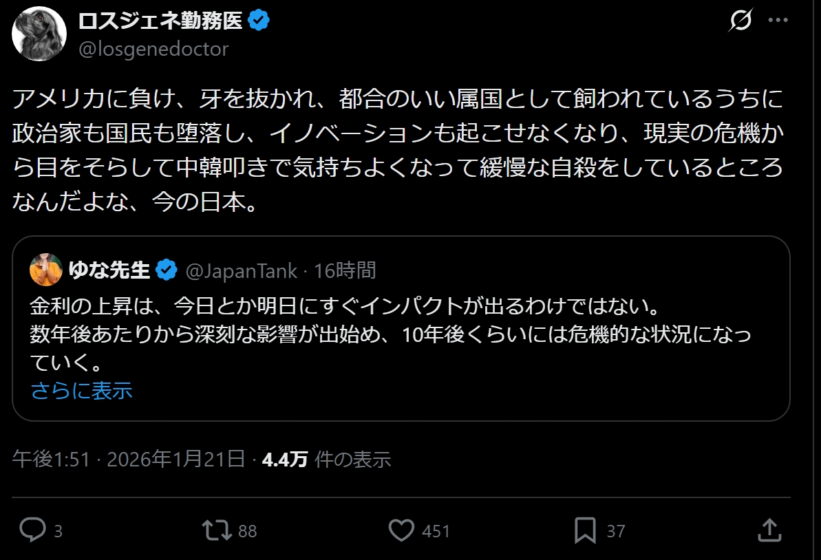 引用元: ・【悲報】識者「経済も文化もアメリカに完全敗北して、日本は中韓叩きをすることしかできなくなった」