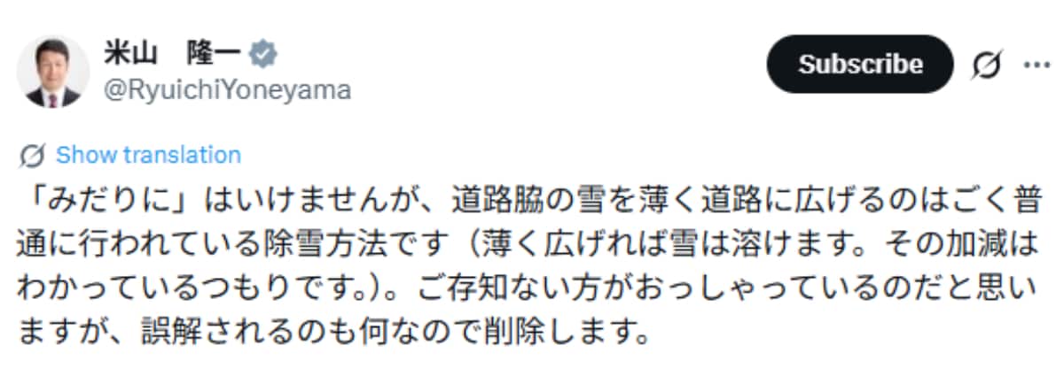 【政治】中道・米山隆一氏の「除雪」でSNSざわつく 分散させて溶かす方法だが…「誤解されるのも何なので」と削除