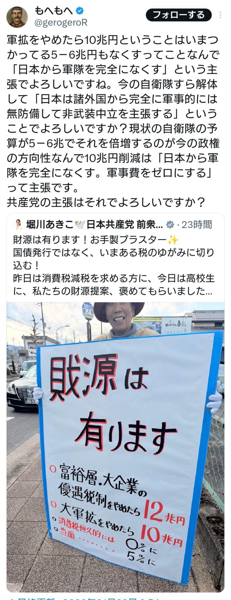 引用元: ・日本共産党「財源はあります。自衛隊を解体し軍事設備や装備を全て売り払うのです」 [662593167]