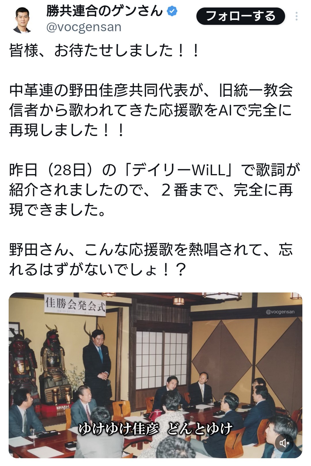 引用元: ・【佳勝会】AIにより応援歌「ゆけゆけ佳彦」が完全再現された模様 [662593167]