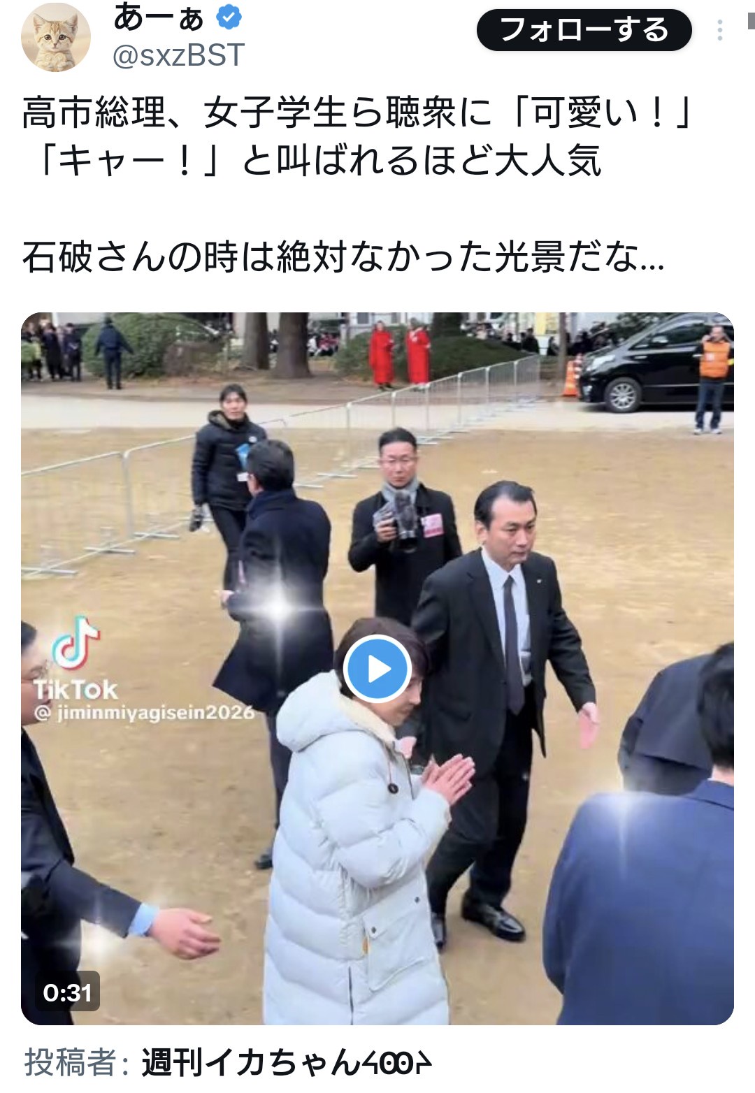 引用元: ・高市総理、仙台にて街頭演説。女子学生ら聴衆に「キャー!」「可愛い!」と叫ばれる [662593167]