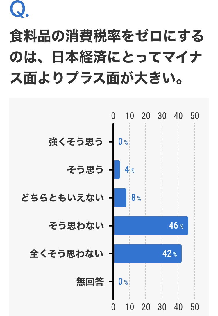 食料品の消費税率をゼロにすることは「日本経済にマイナス面が大きい」との見方が88%に上った。物価高対策としての効果を疑問視する声が多かった。財政や社会保障の持続性を損ない、円安や金利上昇を助長するとの指摘も目立った。