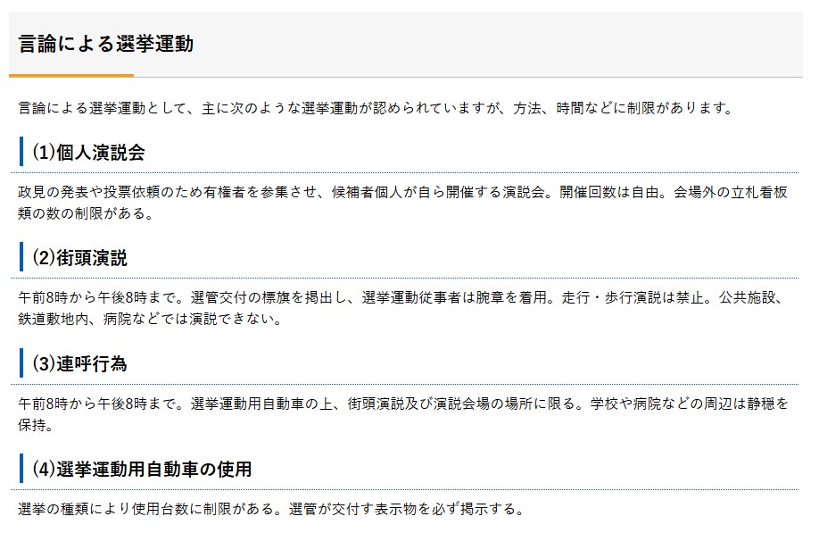 日本では、選挙期間中に候補者が「歩きながら演説する」ことは基本的に違法(公職選挙法違反)です。