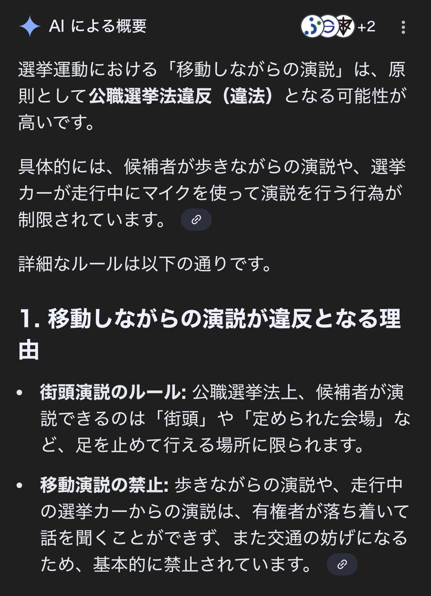 この動画のシーンは、少なくとも「歩きながら演説」の典型例に見えるため、違法行為に該当する可能性が高いと言えます。選挙戦ではこうした微妙な線引きで注意喚起や指導が入ることがよくあります。