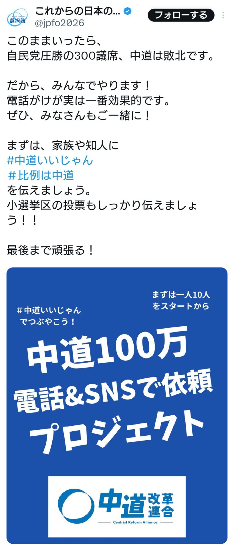 引用元: ・このままいったら中道は敗北です。だからやります!電話&SNSで依頼プロジェクト [662593167]