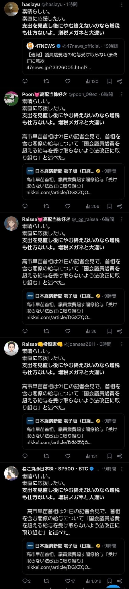引用元: ・【画像】「高市さんの増税は素直に応援したい。増税メガネと大違い」SNSが高市支持者で埋め尽くされる [828293379]