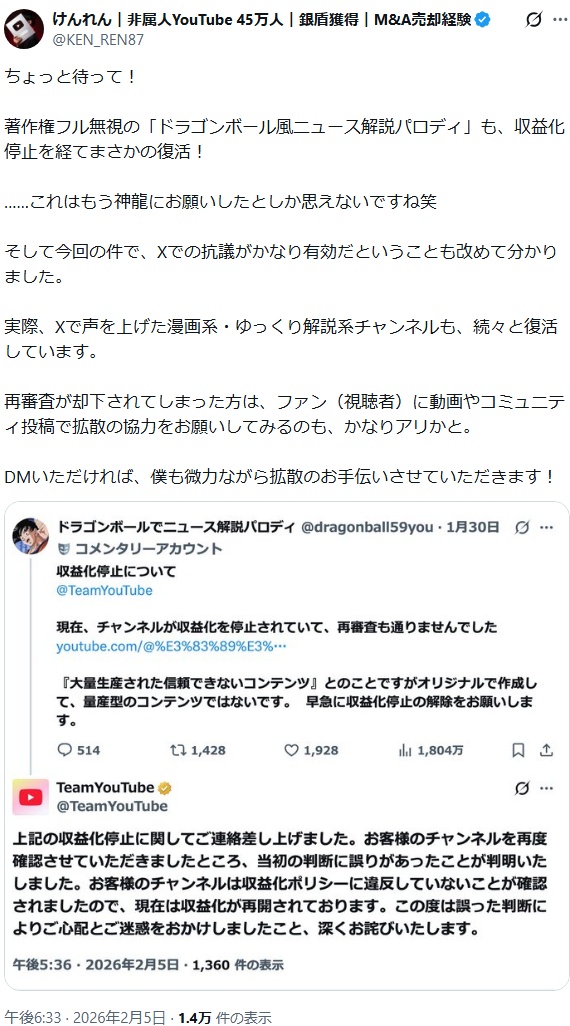 引用元: ・【悲報】収益停止された量産型Youtubeチャンネル、次々と収益復活! [902666507]
