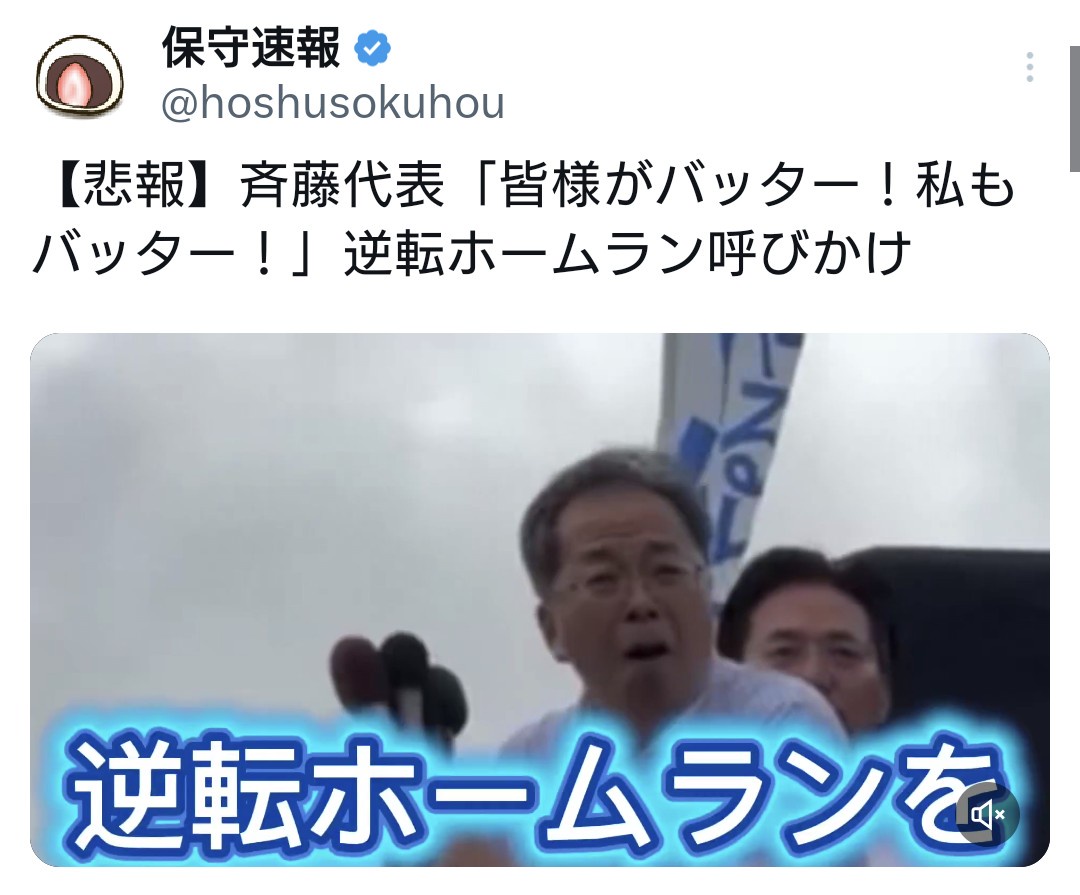 引用元: ・中革連・斉藤氏「逆転ホームランを!皆様がバッターです!私もバッターです!」 [662593167]