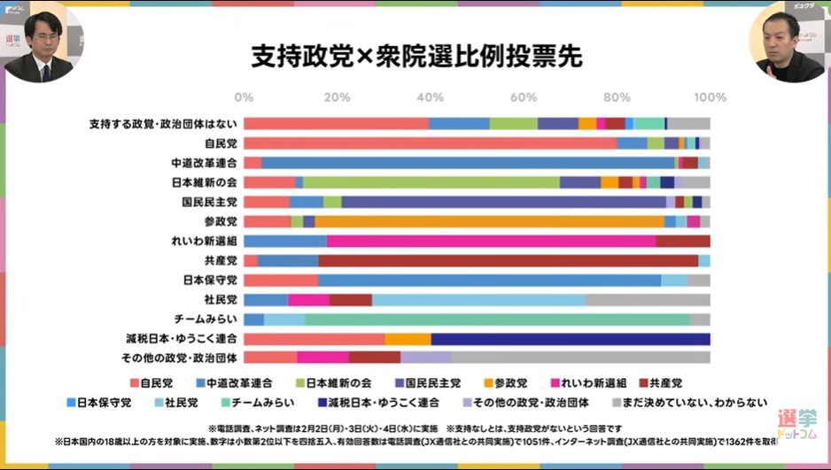 鈴木:中道改革連合については、先に支持政党と衆院比例投票先を集計したスライドを先に見ていただきたいです。中道は中道の支持層をしっかり固めているんですよ。これは他の政党と比較しても相当固まっている方で、8割5分とか9割近く固めているんですよね。