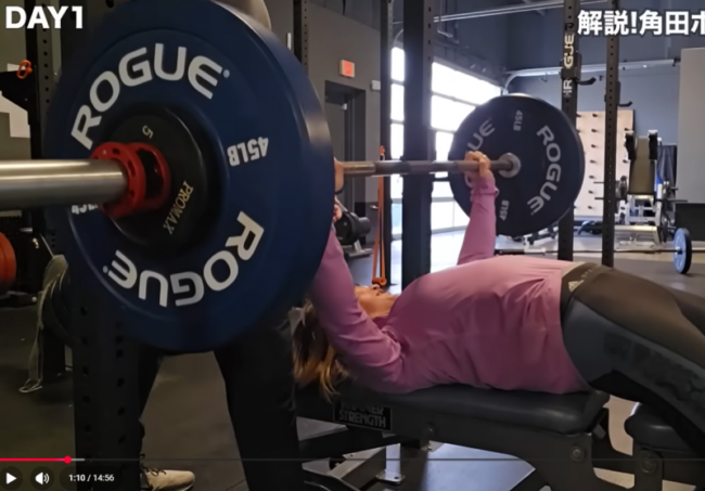 また、胸の日には、角田はベンチプレスで60kgを挙げた。ファンからは「ベンチは自分の体重を上げたら普通は合格、60kgはヤバい」とコメントがあり、胸の日2周目では、ベンチプレスで70kgに挑戦した。残念ながら1回も挙がらなかったが、過去には2回程度挙げていたそうで、動画の中で「70kg、挙がんないなんて終わってんじゃん」と悔しがっていた。金メダリストの負けん気が強い一面が垣間見えた瞬間だった。