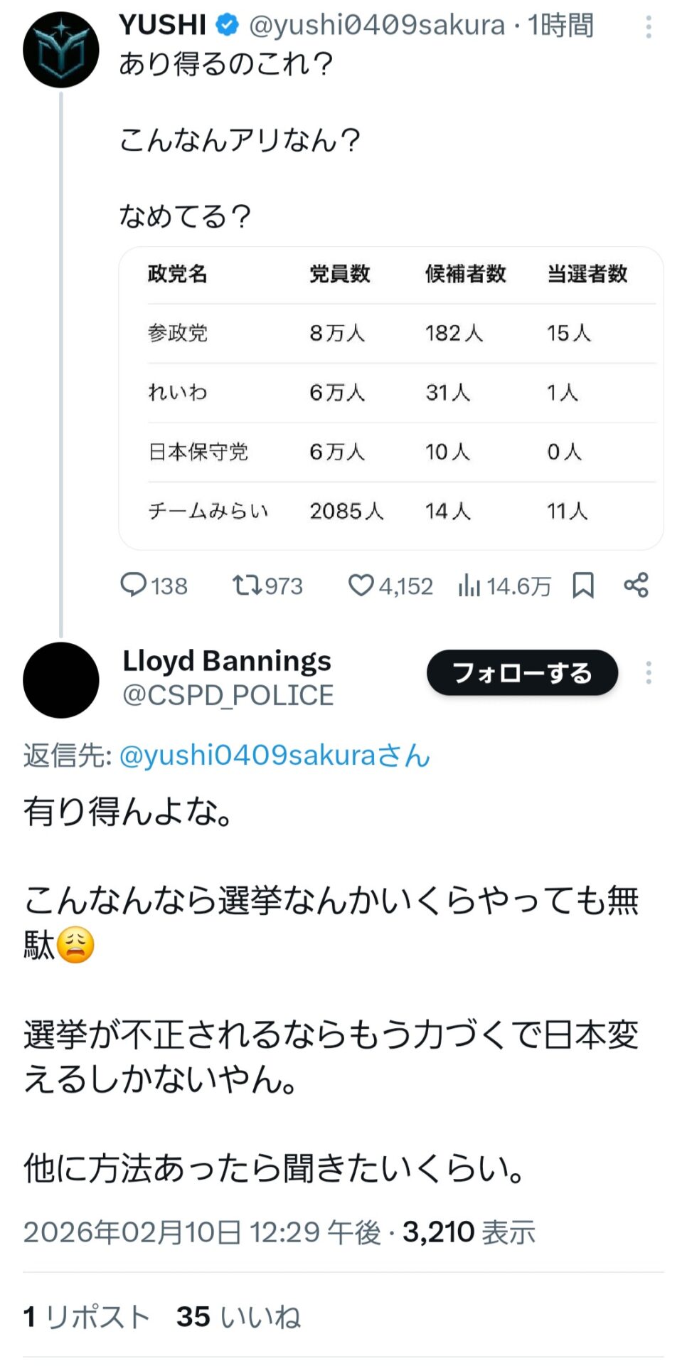 引用元: ・【悲報】陰謀論者「選挙が不正されるならもう力づくで日本を変えるしかない」