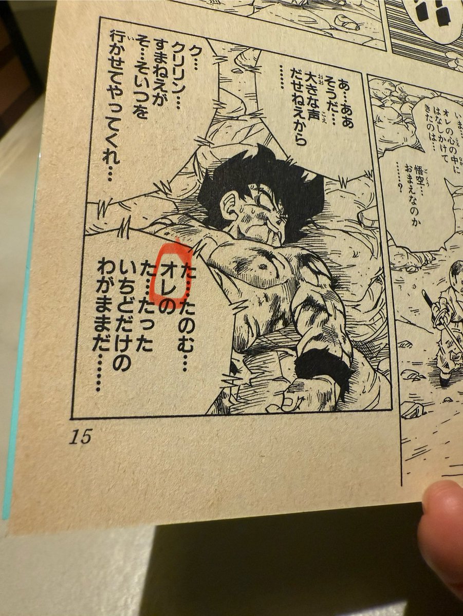 息子とドラゴンボール21巻のベジータとの戦いが終わる辺りを読んでたら、悟空役の息子がここ読んで「悟空が<オレ>って言ったー!」ってびっくりしたから、前後をチェックしてもここ以外はやっぱ「オラ」としか言ってない…ちなみにこれは1990年発行の単行本で、うちにあるもう一冊の2024年発行の方もチェックしたら同じだったからずっとこうみたい 二人でこの発見に盛り上がったんだけどこれってファンの間では有名な話なのかな?