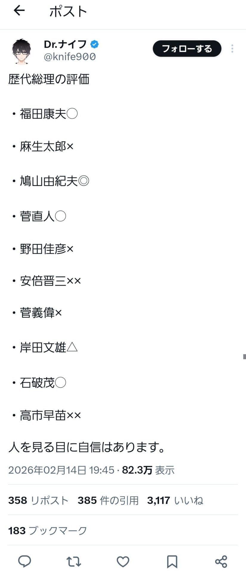 引用元: ・Dr.ナイフさん、歴代総理を評価 鳩山◎菅直人◯野田×安倍××菅義偉×岸田△石破◯高市×× [917589786]