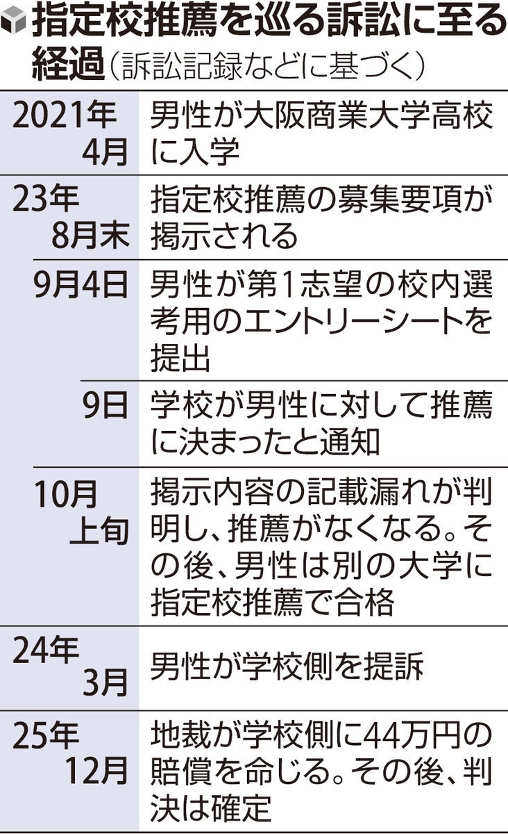 志望大学への指定校推薦が、学校のミスで得られなかった――。大阪商業大学高校(東大阪市)を卒業した男性(19)が、学校側に慰謝料など220万円の損害賠償を求めた訴訟の判決が地裁であり、黒田香裁判官は44万円の支払いを命じた。学校側の不手際で「他の受験先の選考を受ける機会が失われた」と判断した。(林信登)