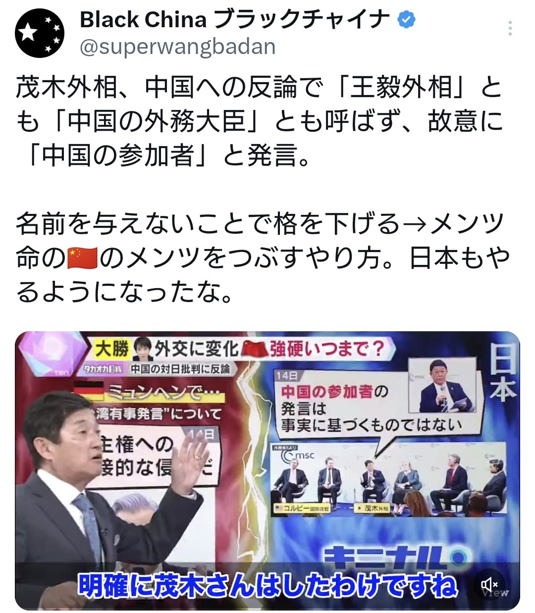 引用元: ・茂木外相、王毅氏を「王毅外相」とも「中国の外務大臣」とも呼ばず故意に「中国の参加者」と発言 [662593167]