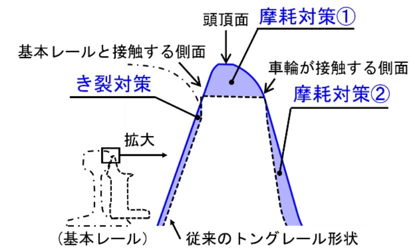 従来型のトングレールでは、先端が薄く複雑な形状であるため、摩耗やき裂が発生しやすく、東海道新幹線の本線では一般のレールに比べて約7分の1の期間である2年程度の周期で取り替える必要があるといいます。