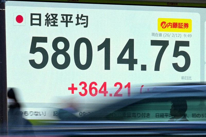 株式市場は「高市トレード」に沸いている。日経平均株価は一時5万8000円台となり取引時間中の最高値を更新した=東京都中央区で2026年2月12日午前9時49分、渡部直樹撮影