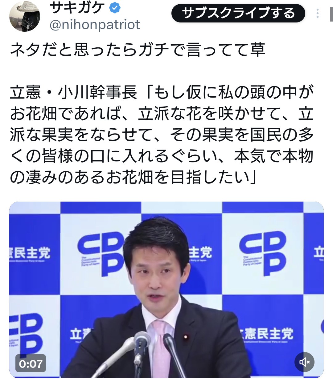引用元: ・立憲・小川幹事長「もし仮に私の頭の中がお花畑であれば、立派な花を咲かせせたい」 [662593167]