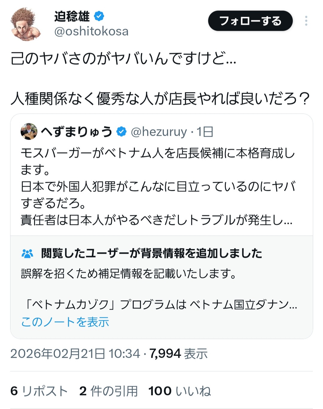 1: それでも動く名無し 2026/02/23(月) 14:41:08.16 ID:krm0yzHN0 ええんかこれ 引用元: ・ネトウヨ「ベトナム人店長のモスはダメだ!マクドナルドに行く」日本マクドナルド […]