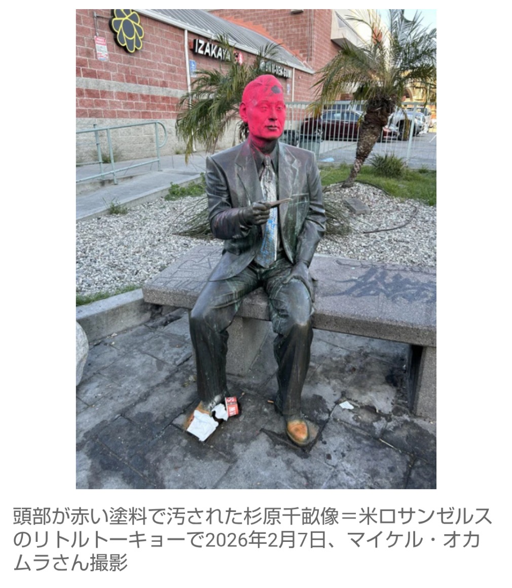 リトルトーキョー歴史協会のマイケル・オカムラ会長によると、杉原像の汚損が確認されたのは2月7日午後(現地時間)。頭部全体に赤い塗料が吹き付けられていた。6日から7日にかけて汚されたとみられる。これまでもいたずら書きされるなどのケースはあったが、今回ほどの被害は初めてという。