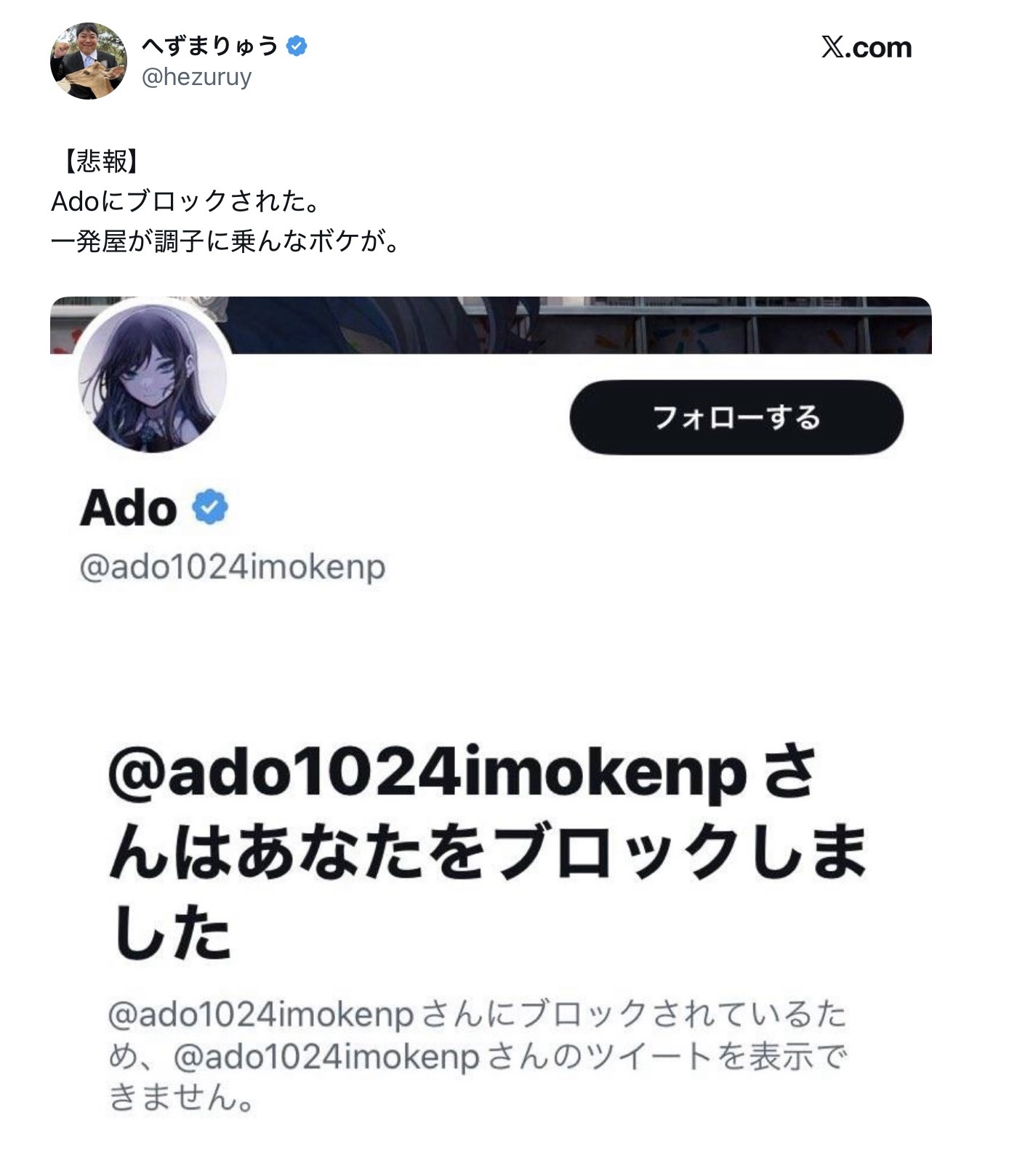 引用元: ・【朗報】漢ado、へずまりゅうをブロック。へずまブチギレwwwwwwwwwwwwwwwwww