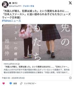 1 名前:::2026/03/05(木) 19:55:38.33 ID:N2Y1ZbK50.net 2BP(1500)川口市で外国人が増えているのは確かで、04年に1万4679人だったのが、 24年で4万3128人とほぼ3倍になっている。だが、市内の刑法犯の認知数は04年に1万6314件だったのが、20年に4529件。人数が3倍になって、犯罪は3分の1になっている。引用元https://news.yahoo.co.jp/articles/8ed2f4ab5e069532943a3f7dd3ba22b805770e59?page=4 .t_b{ font-weight: bold; font-size: 16px; margin-bottom: 70px; margin-top: 8px; line-height: 1.8; }3: 黒(ジパング) [CN] 2026/03/05(木) 19:56:39.16 ID:4dsmQgx50 事故とか犯罪は警察の匙加減で決まるもの 4: ベンガルヤマネコ(庭) [US] 2026/03/05(木) 19:56:48.70 ID:OEk9KhCJ0 警察が機能してないだけでは 7: ピクシーボブ(神奈川県) [HU] 2026/03/05(木) 19:57:34.41 ID:RBtdRND70 で重犯罪の数は? 8: スナネコ(やわらか銀行) [RO] 2026/03/05(木) 19:57:34.93 ID:4u019V310 で、総数と日本人との比率は? 10: クロアシネコ(茸) [CA] 2026/03/05(木) 19:57:58.72 ID:IamQRMq+0 日本人が減りそんだけ不起訴の数が増えてるだけだろ(;´Д`) 元スレ:https://hayabusa3.2ch.sc/test/read.cgi/news/1772708138/