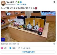 1 :鉄チーズ烏 ★:2026/03/05(木) 21:54:14.69 ID:zOHjjprc9.net3/5(木) 21:05配信 SmartFLASHhttps://news.yahoo.co.jp/articles/e995d6322cc553934a9fb482340609d5f503833a 3月3日のひな祭りをめぐり、一風変わった“ひな人形”を紹介したテレビ番組の場面を切り抜いた動画がSNSで拡散し、思わぬ議論を呼んでいる。「ふつうは男女一対のひな人形ですが、『男びな・男びな』、また『女びな・女びな』と、同性同士の組み合わせのひな人形が作られていることを報じたニュースの動画が拡散しました」(芸能記者) 動画は、2月28日放送のNHK『サタデーウオッチ9』で紹介された特集を切り抜いたもの。現在、動画は投稿から削除されている模様で、「このメディアは、著作権者からの申し立てにより無効になりました」と表示されている。引用元https://news.yahoo.co.jp/articles/e995d6322cc553934a9fb482340609d5f503833a .t_b{ font-weight: bold; font-size: 16px; margin-bottom: 70px; margin-top: 8px; line-height: 1.8; } 2: 名無しさん@恐縮です 2026/03/05(木) 21:55:13.13 ID:hj6YMXtQ0.net 雛人形がで何が悪い 6: 名無しさん@恐縮です 2026/03/05(木) 21:58:12.50 ID:8HiPbeTU0.net 需要があるなら買われるから作られるし 需要がないなら買われないから消えていくだろ 7: 名無しさん@恐縮です 2026/03/05(木) 21:58:28.42 ID:PeEMCT1H0.net 気持ち悪い 11: 名無しさん@恐縮です 2026/03/05(木) 21:59:55.38 ID:UpyBnDHk0.net 同性カップルの養子も将来同性カップルしたいのか。単純に遺伝子の問題と思っていたが後天的な思想のせいだな。 12: 名無しさん@恐縮です 2026/03/05(木) 22:00:39.69 ID:vx4a8rBj0.net そのうちリカちゃん人形にチンポがはえたニューハーフちゃん人形も発売されるのかしら 元スレ:https://hayabusa3.2ch.sc/test/read.cgi/mnewsplus/1772715254/
