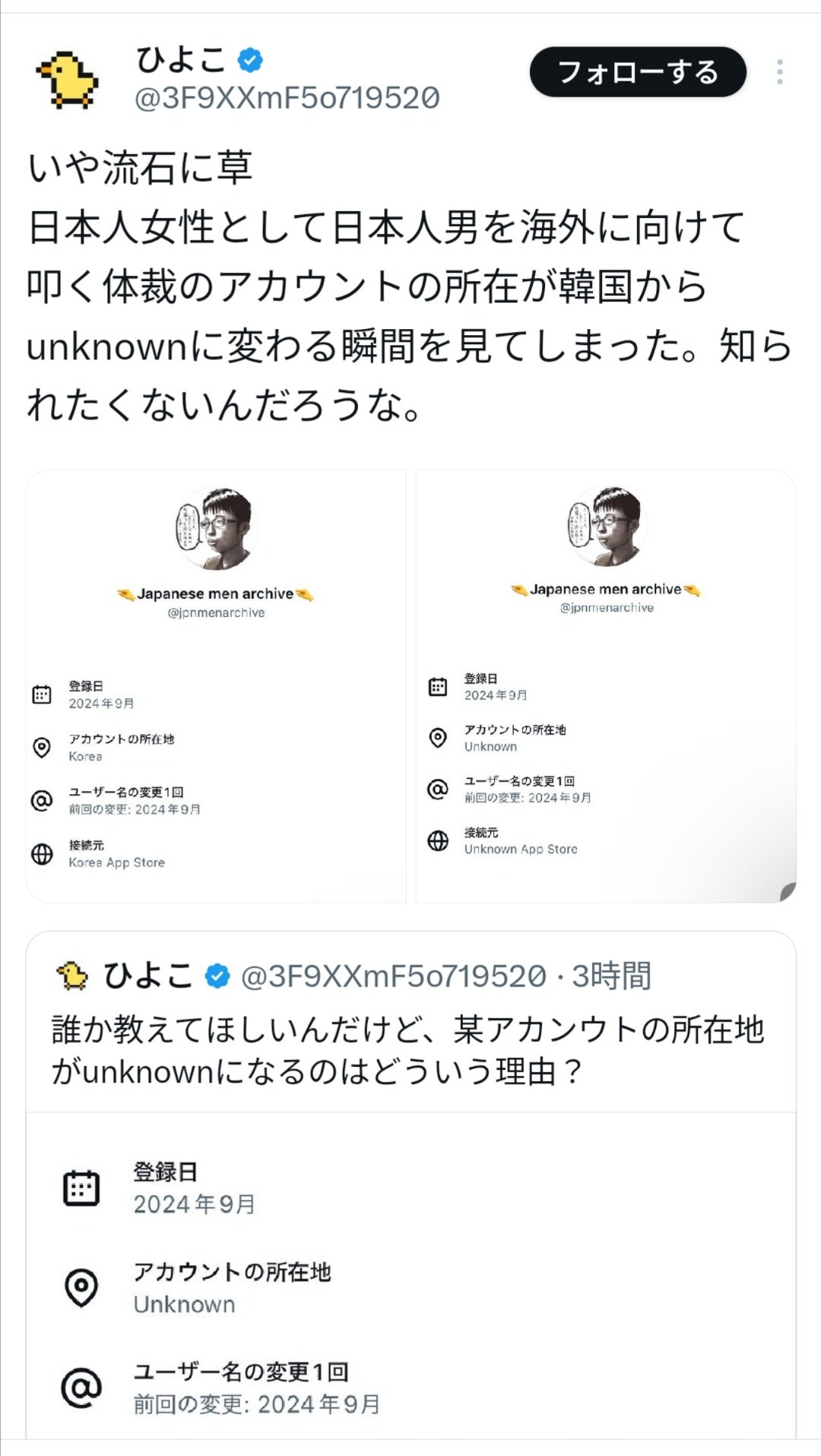 1: それでも動く名無し 2025/11/23(日) 15:53:59.95 ID:hOjdiEw80 引用元: ・【悲報】Xで日本人男を叩いていたツイフェミアカウント、韓国人だったwwwwwwwwww